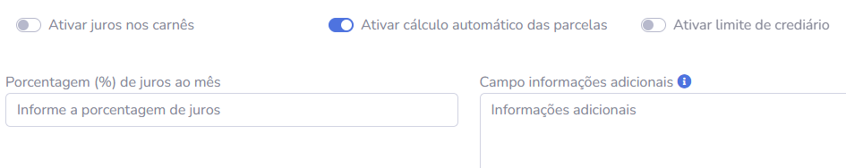 As configurações de carnês permitem personalizar regras importantes para o controle de pagamentos parcelados. No menu "**Minha loja**", você pode definir como os carnês serão calculados, se haverá cobrança de juros em atrasos e até incluir informações adicionais no canhoto impresso.&#x20;